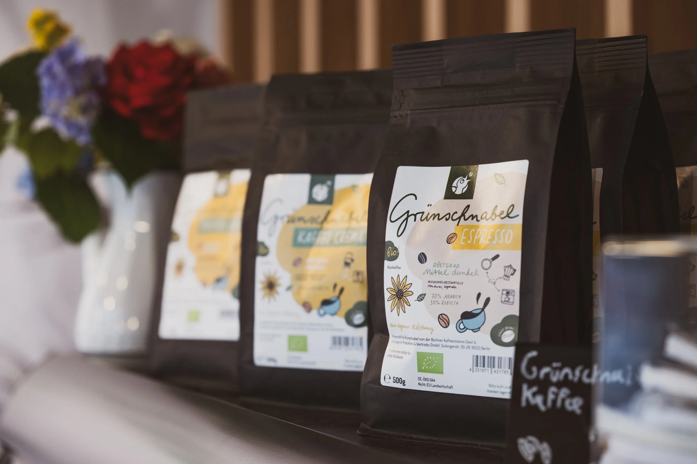 Kaffee-Etiketten für GRÜNSCHNABEL Bio-Frischemarkt, Berlin, 2025